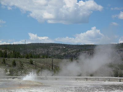充滿興奮地開到Trail的起點,原來它就在餅乾盆地(biscuit basin)的裡面再進去,下了車帶好裝備跟水,才走沒幾步....就突然下起貓跟狗了.... = =|||| 搞屁呀!!! 雖然很無奈,不過還是只好回到車上,雨愈下愈大,在黃石公園下大雨就真的沒什麼地方好去了,於是我們只好打道回府,半路上又遇到嚴重大塞車,原來是那些死野牛在到處亂竄…